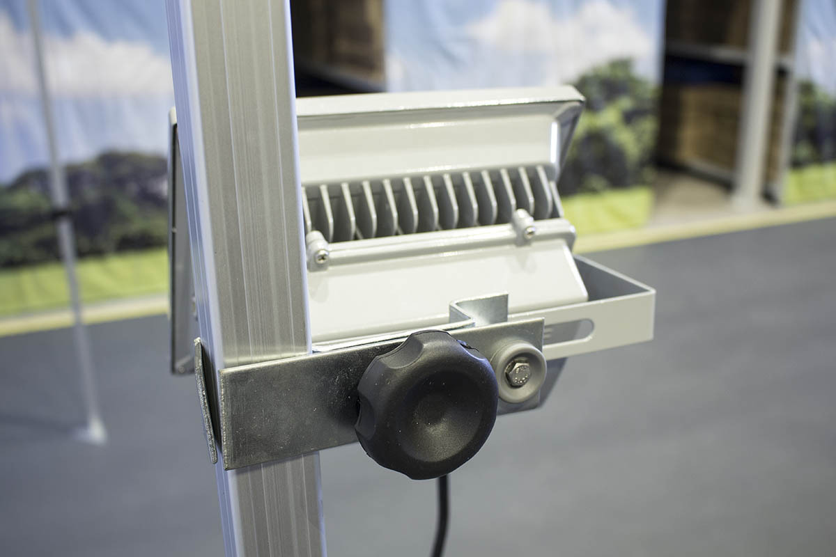 Mit nur ein Paar Handgriffen lässt sich die Lampenhalterung an dem Standbein des Zeltes montieren,