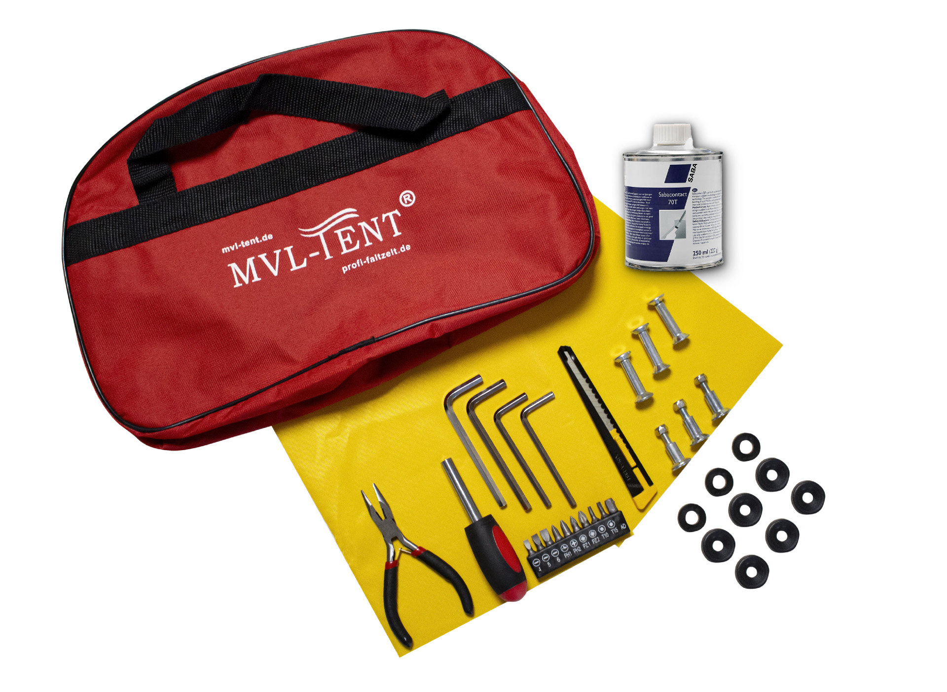 Den Inhalt des MVL-TENT® Reparatur-Sets haben unsere Techniker speziell für MVL-TENT® Faltpavillons zusammen gestellt und abgestimmt.
