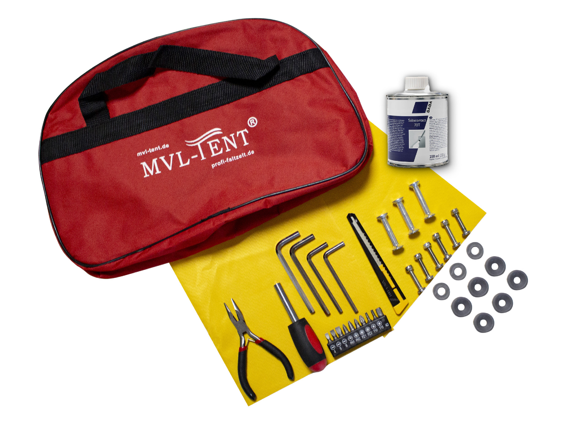 Den Inhalt des MVL-TENT® Reparatur-Sets haben unsere Techniker speziell für MVL-TENT® Faltpavillons zusammen gestellt und abgestimmt.